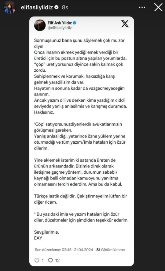 Tunaoğlu Instagram hesabından paylaştığı bir diğer açıklamada ise “Sormuşsunuz bana şunu söylemek çok mu zor diye! Onca insanın ekmek yediği emek verdiği bir üretici için bu postun altına yapılan yorumlarda, “çöp üretiyorsunuz” deyince sakin kalmak çok zordu. Sahiplenmek ve korumak, haksızlığa karşı gelmek yaradılışım da var. Hayatımın sonuna kadar da vazgeçmeyeceğim sanırım. Ancak yazım dili vs. derken kime yazdığım ciddi seviyede yanlış anlaşılmış ve karışmış durumda haklısınız. ‘Çöp satıyorsunuz’ diyenlerdir avukatlarımızın görüşmesi gereken. Yanlış anlaşıldığı, yeterince özne yüklem yerine oturmadığı ve tüm yazım/imla hataları için özür dilerim. Yine eklemek isterim ki satan da üreten de ürünün arkasındadır. Bizimle direk olarak iletişime geçme yönetimi, durumun sebebi/kaynağı belli olmadan kamuoyunu yanıltma olmamasını tercih ederdim. Ama bu da kabul. Türkçe lastik değildir, çekiştirmeyelim lütfen bir diğer ricam. Bu yazıdaki imla ve yazım hataları için özür diler, düzeltmeler için şimdiden teşekkür ederim”